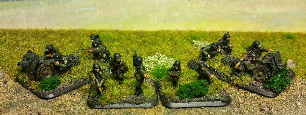 Back to my Barbarossa German project again with most of their support weapons. An infantry gun platoon and two anti-tank platoons of two guns each. I'm probably going to run the PaK38's as one platoon of 3 guns, but they are sold in blisters of two so I painted the extra anyway.